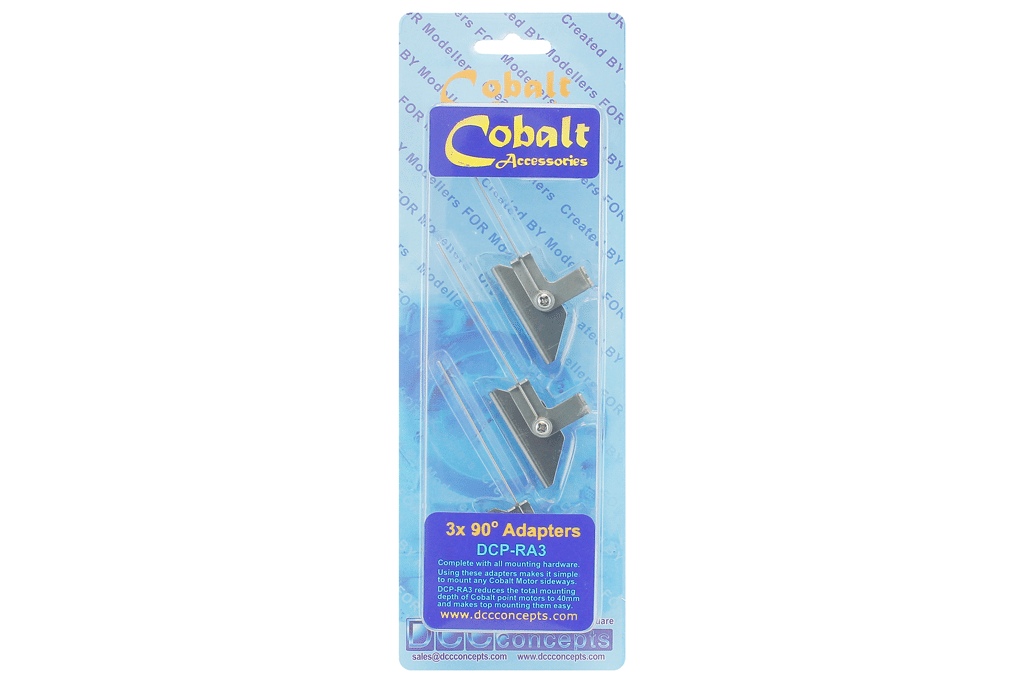 The Cobalt right-angle adapter will allow you to install your Cobalt motors horizontally, reducing installation height from 67mm to just under 40mm. With the addition of a small wooden spacer (height will depend on your roadbed thickness), it will also allow easy “above board mounting” of Cobalt motors for areas where space below the track-bed is not available.