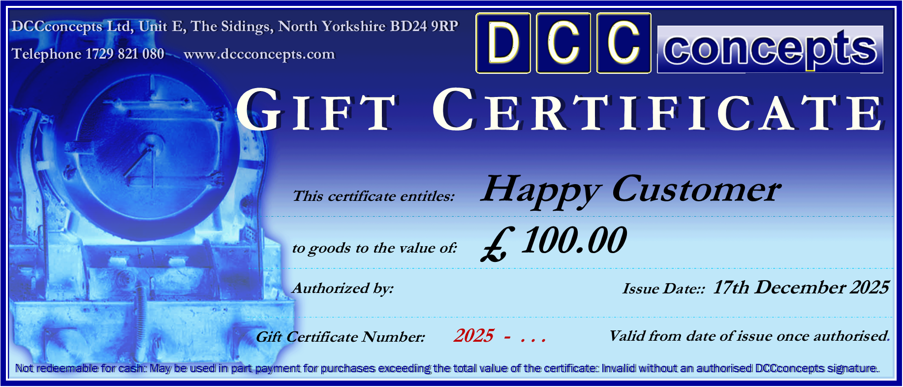 The ideal gift for any railway modeller – a DCCconcepts Gift Voucher to the value of your choice in multiples of £10.00.