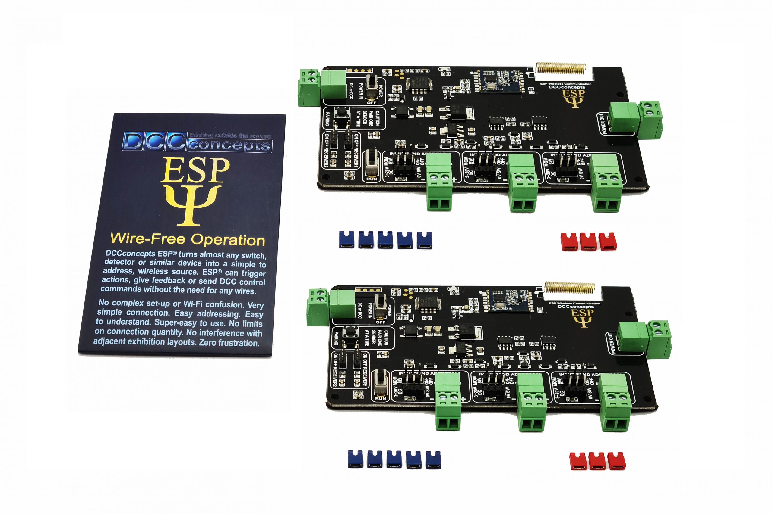 To complete your wire-free installation, the DCC-ESPS.6 is paired with the DCC-ESPR.1 receiver which receives the commands and delivers them to your DCC system or control panel, either as a direct DCC command or as a “sniffer” device, so your screen-based DCC system can also receive feedback.
