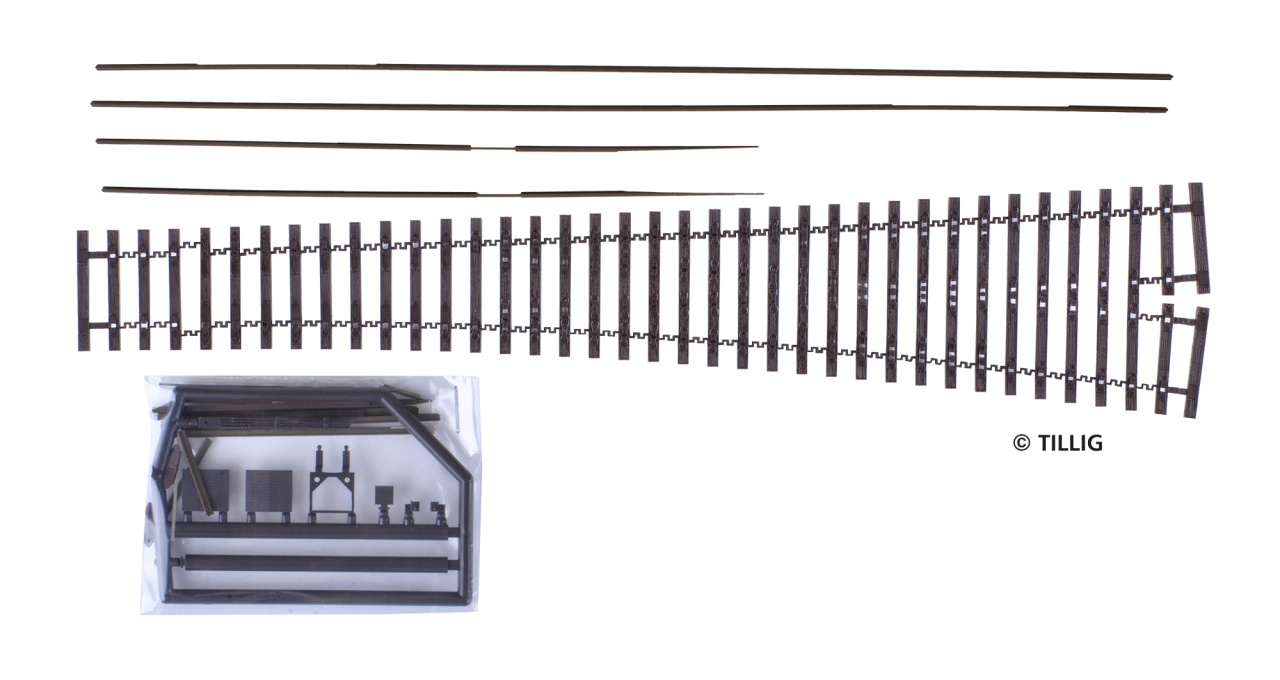 An easy to build kit of a nice gentle point that can be built straight or curved. Frog 9 degrees. Perfect match for all Tillig Elite trackwork of course!