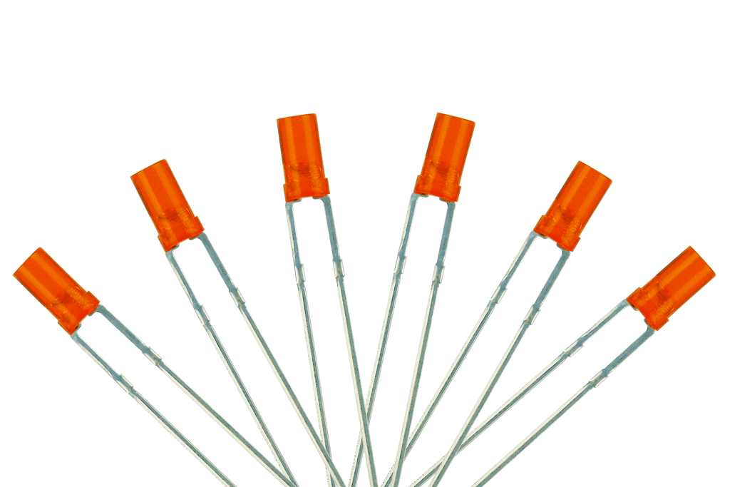 A pack of 6x signal amber 3mm flat front LED. Pack includes 6 x 1k resistors.