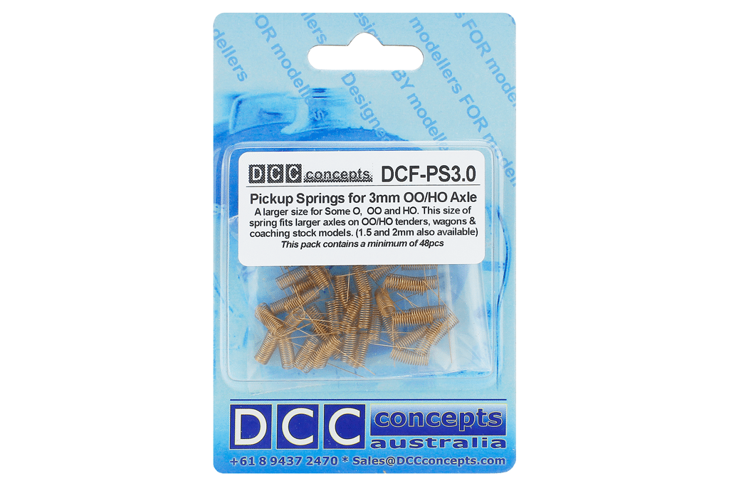 48 springs, sized perfectly for zero friction addition when used to add power pickup on 3.0mm axles (Some O, some OO and HO wagon/coach stock and some tender axles). They are a delight to use. – Simply remove one wheel, add the spring and replace the wheel-set, making sure you note which wheel is ‘live’ to the track. Drill a small hole in the floor of the coach/tender/caboose etc, and solder a bit of fine wire to the tag end on the spring. Connect the wire to your flickerfree or loco pickups etc. You will be delighted these friction-free pickups. They will add nothing to the drag at all and will always be able to give perfect pickup as long as you keep track and wheels reasonably clean.