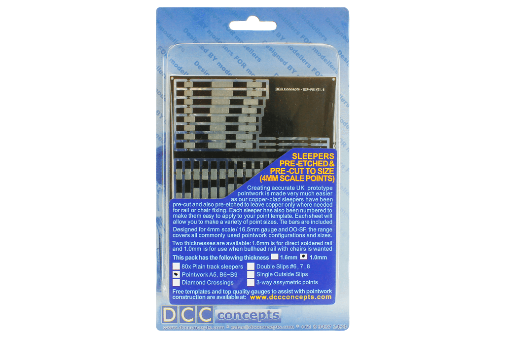 4mm scale UK prototype Pointwork sleepering, pre-etched. This fret contains enough correct length sleepers to allow any point between B9 and B6 and A5 to be constructed. Tie Bars included. Sleepers are 1.0mm thick for chaired or thin sleeper construction.
