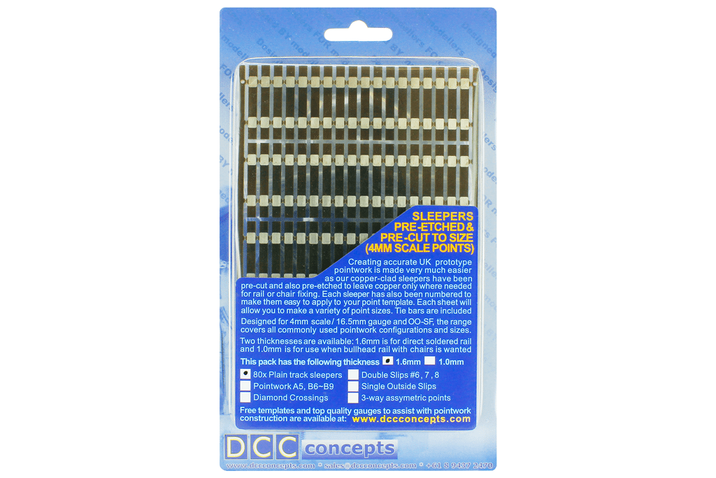 4mm scale UK prototype sleepering, pre-etched. This fret contains 80 sleepers for plain pointwork-related track, each 1.6mm thick for direct soldered construction (32mm long).