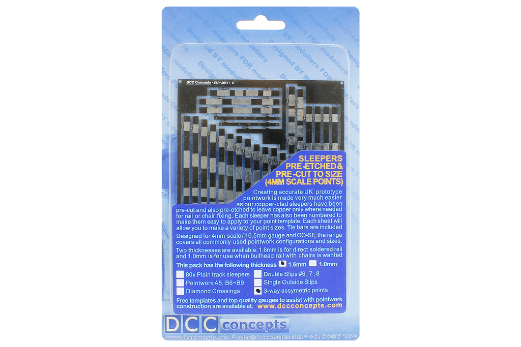4mm scale UK prototype 3-way Point sleepering, pre-etched. This fret contains enough correct length sleepers to allow a three way point to be constructed. Sleepers are 1.6mm thick for direct soldered construction.