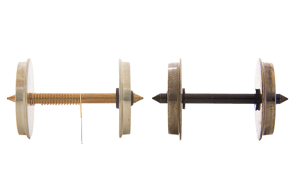8prs of 12mm super-quality wheelsets for EM/18.2mm track, each live axle to one wheel and pre-fitted with our pickup springs. Superb free-running wheel profile slightly better than RP25-88. Super fine tolerances in manufacture of -0, +0.002″.. Including for squareness on the axles (Which is why we pack them so well – you cannot ship fine-scale wheels in a bag without risking quality). Gauge preset to the optimum running with this wheel profile – Please do not adjust unless absolutely necessary for your specific trackwork. Also included in each pack are a few more pickup springs and fine black wire for connections. (If you do not need them, remove springs by simply pulling firmly on the spring tab).