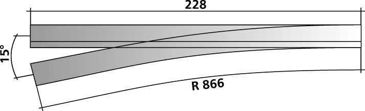 The 85197 is an HO/HOm (12mm gauge) dual gauge point, with both HO and HOm through the straight part of the turnout. The turnout re-routes only the standard gauge rails. Overall length is 228mm. Turnout angle is 15 degrees and the radius at the curve is a gentle 866mm.