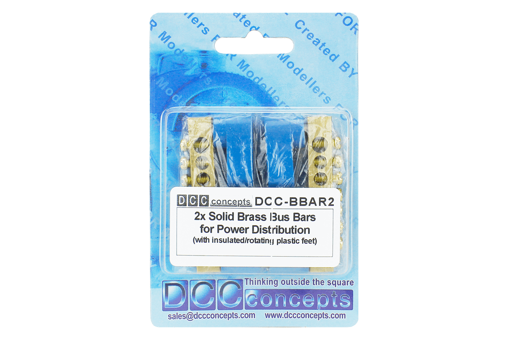 Pack of TWO solid brass power distribution bars. The hobby has looked for something like this at an affordable price for a very long time! DCCconcepts has created these tough, machined brass ‘power bus’ distribution bars with insulated, swivelling feet especially for DCC layout wiring.